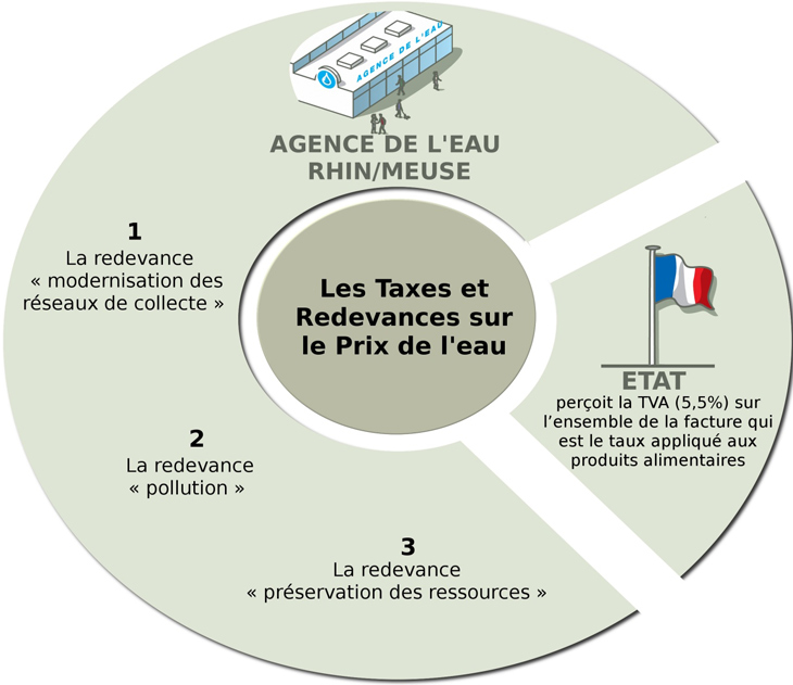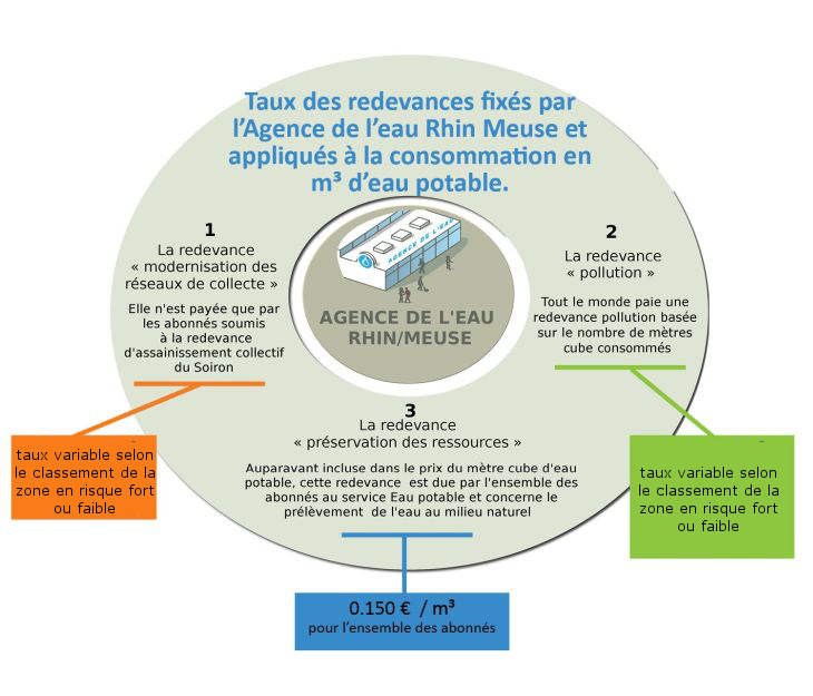 • L’Agence de l’eau Rhin/Meuse, qui perçoit les redevances « préservation des ressources » ; « pollution » et « modernisation des réseaux de collecte » pour financer les actions de protection et de restauration des milieux aquatiques et des ressources en eau. Elle subventionne également, grâce à ces redevances, les collectivités et les industriels en équipements de dépollution des eaux usées.