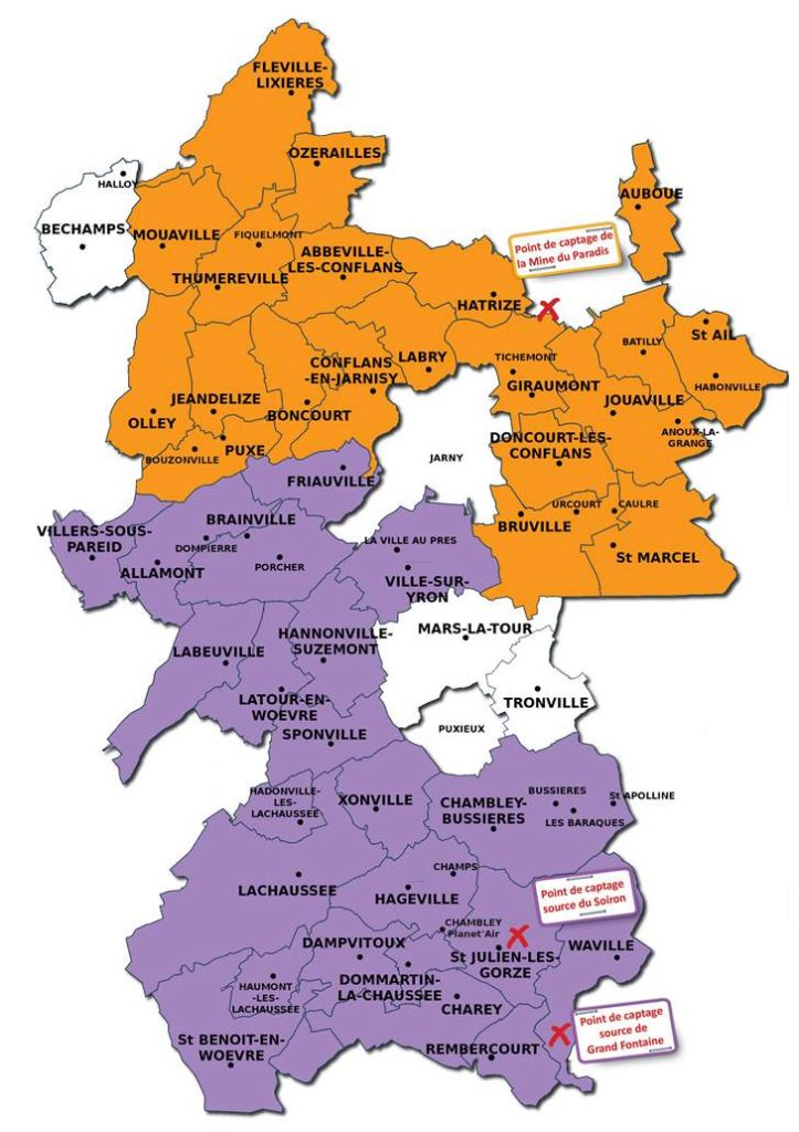 Le SIEGVO (Syndicat intercommunal des Eaux de Gravelotte et de la Vallée de l’Orne) fournit au Syndicat une eau traitée issue d’un mélange d’eau de sources, d’eau de mine (mine de Valleroy) et si besoin d’eau en provenance de la ville de Metz pour un volume moyen de 5000 m³ par an.
